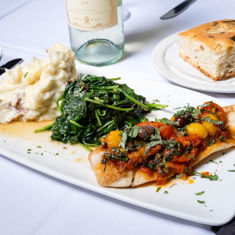 Tomatoes, Greek olives, capers, garlic, and olive oil served with mashed potatoes and spinach