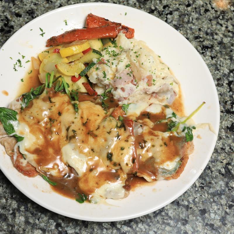 Veal scallopini with Marsala wine, mozzarella cheese, prosciutto di Parma, and spinach served with mashed potatoes