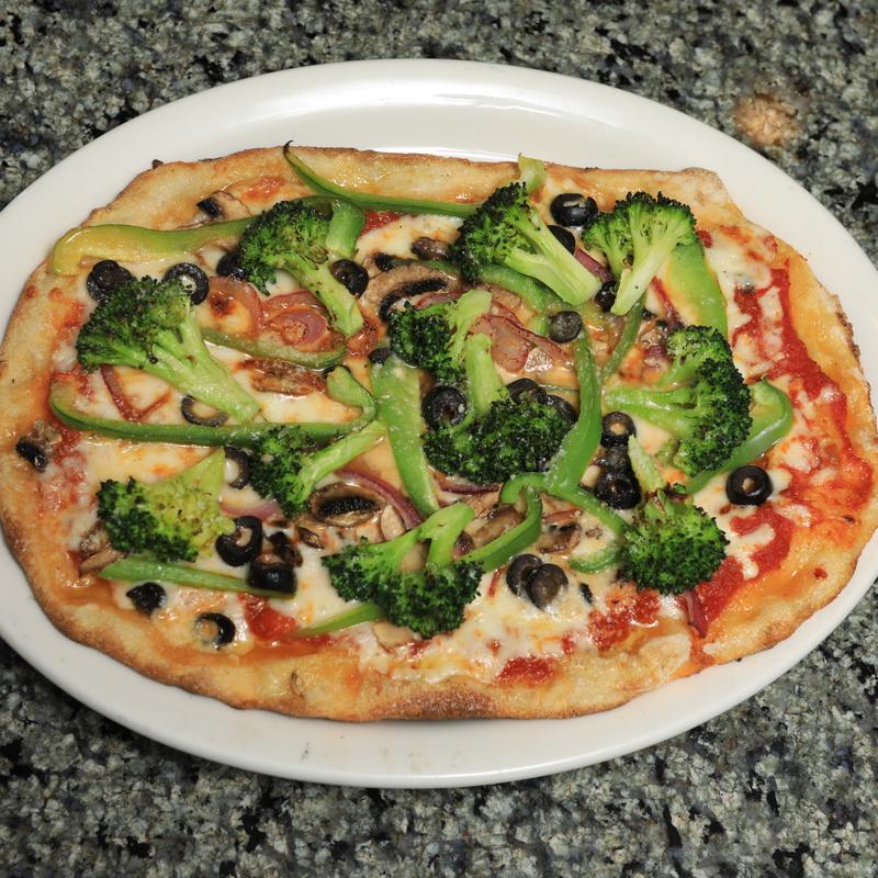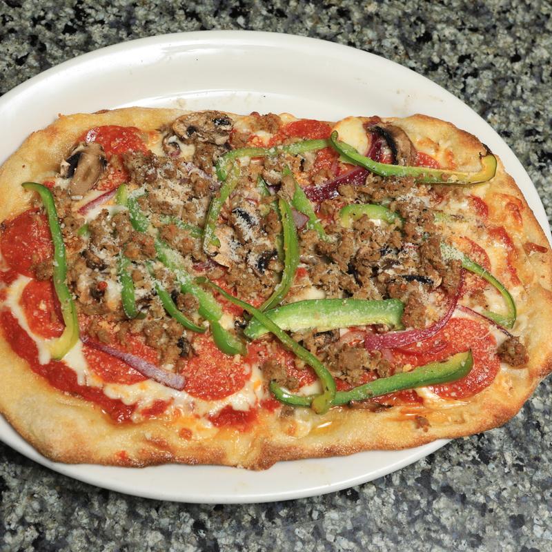 Pepperoni, sausage, mushroom, peppers, onion, mozzarella, and plum tomato sauce