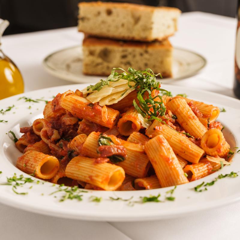Rigatoni pasta sautéed with pancetta, garlic, onions, crushed red pepper flakes, extra virgin olive oil, with a touch of marinara sauce and parmesan cheese