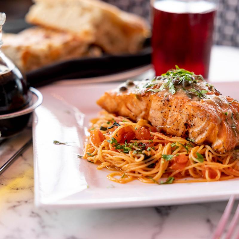 Free range chicken breast sautéed with lemon butter and capers sauce, served with linguini