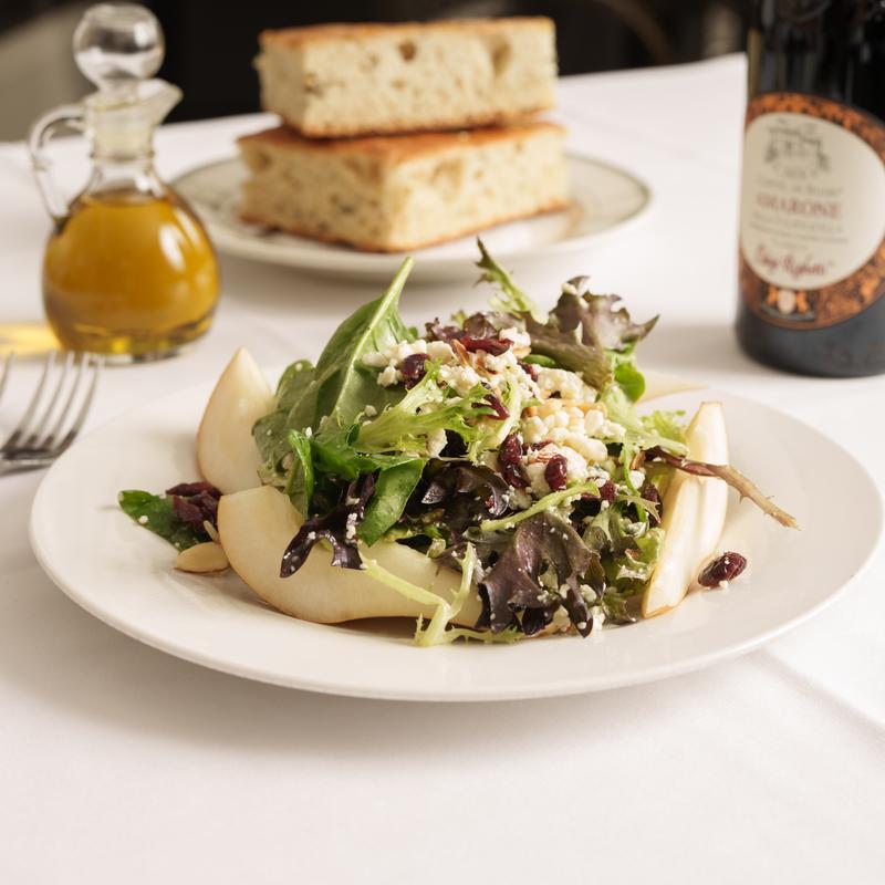 Gorgonzola cheese, field greens, pears, sliced almonds, dreid cranberries with citrus dressing